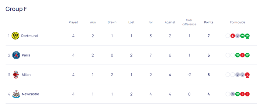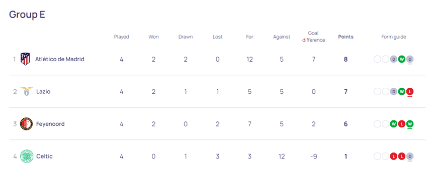 在另一场比赛中,拉齐奥主场以1-0小胜费耶诺德,全场唯一进球出现在第45+1分钟,费利佩-安德森直传,因莫比莱越位门将后推射空门得分。4轮比赛后,马德里竞技以2胜2平积8分位居小组榜首,拉齐奥以2胜1平1负积7分排名第二,费耶诺德则以2胜2负积6分排名第三,而凯尔特人以1平3负积1分垫底。